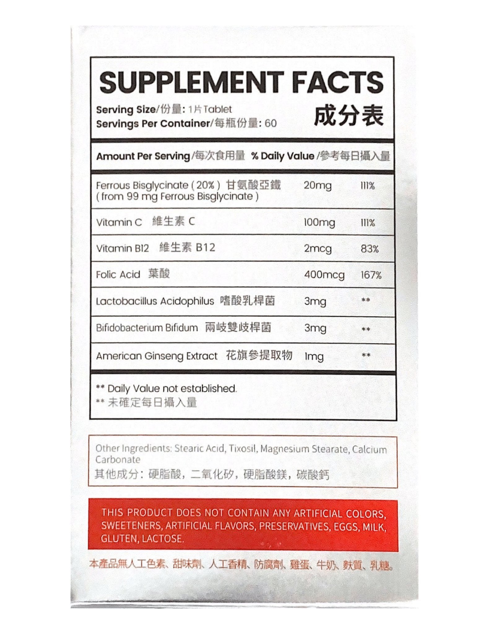 - 雙甘酸亞鐵吸收佳、不刺激腸胃